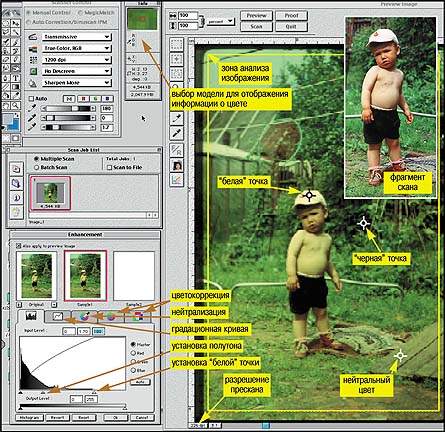 На практике можно достаточно корректно откалибровать систему, добившись соответствия изображения на мониторе и цветопробе. Выбор оптимальной гаммы зависит от опыта и художественного вкуса. Важно, чтобы предварительный вид оригинала в программе сканирования и его изображение в окне Photoshop были достаточно близки.