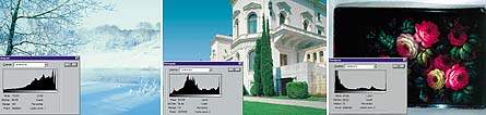 Кроме характера изображения, на гистограмме хорошо виден уровень яркости в самых светлых и темных областях картинки, называемых белой и черной точкой соответственно. Это очень важные понятия цветокоррекции. Часто можно существенно преобразить иллюстрацию, лишь установив нужное значение для белой точки, которая, впрочем, совсем не обязательно должна быть абсолютно белой, т.е. иметь яркость, равную 255. В полиграфии за уровень белого в изображении принимают такой процент красочного покрытия, который может быть гарантированно воспроизведен при печати. Так, для высококачественной печати на мелованной бумаге яркость белой точки принимается равной 245 (96%), или в системе триадных красок: Cyan — 5%, Magenta и Yellow по 3%, Black — 0%, а для газетной бумаги — 6—8%. Для черной точки в печати тоже не- применим абсолютно черный цвет, так как количество наносимой на оттиск краски ограничено, и потому яркость ее обычно не превышает 320—350% в системе CMYK, или 4% в процентной шкале яркости. Если оригинал сканируется только для просмотра на мониторе, например в Internet, то значения для белой и черной точек могут составлять 255 и 0 соответственно.